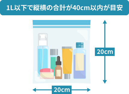 - 100ml 以下の容器に入った液体物(但し、ライター用充填ガス等の機内持込禁止品は除く)で、容量1L 以下で縦横の辺合計 40cm 以内の透明かつ、再封可能なプラスチック袋に入れられている場合